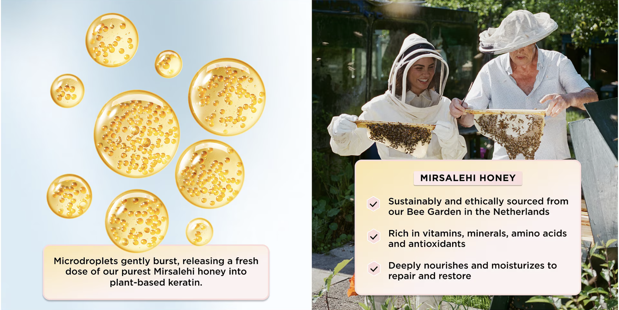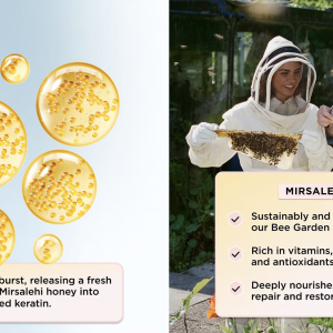 • Encapsulated Mirsalehi honey droplets deliver a burst of long-lasting moisture and shine